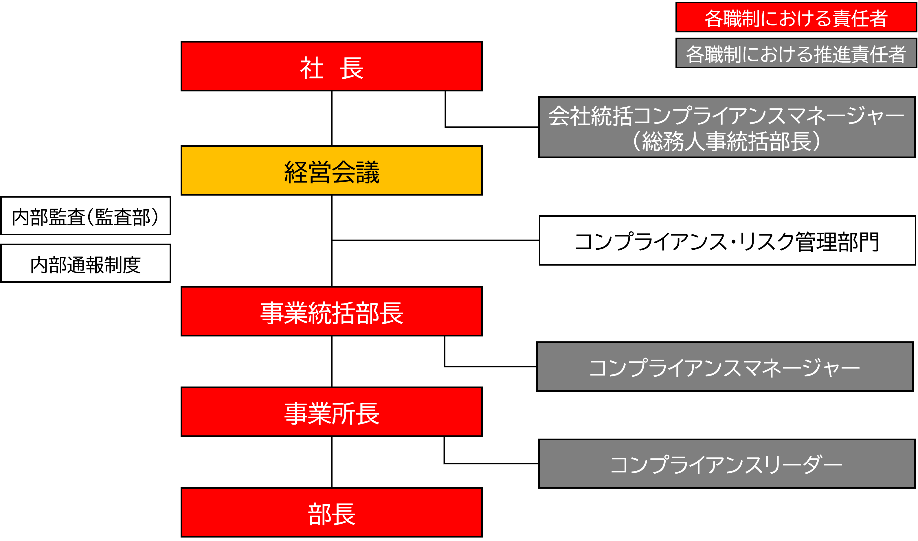 また、「コンプライアンスの推進は、事業推進と一体不可分」との認識の下、各職制における責任者とこれを補佐するを推進体制を構築しています。