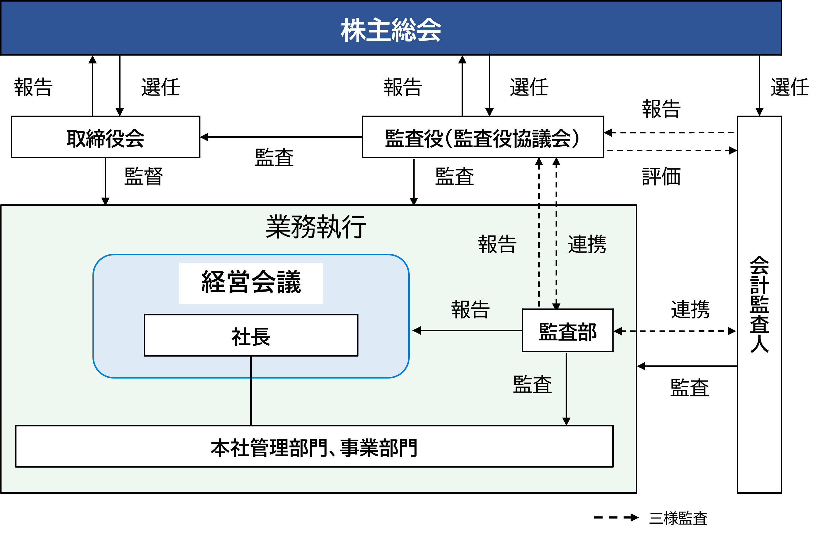 当社では、定期的に取締役会を開催し、法定事項や重要な経営の意思決定及び業務執行の監督を行っています。独立性を確保した監査役が経営と業務執行の監査を行っており、監査役、内部監査部門(監査部)及び外部の会計監査人の三者が定期的に情報交換を行うことにより、内部統制の実効性の向上に努めています。また、当社の内部統制システムは、取締役会で決議した「内部統制システムの整備に関する基本方針」に則り運用・整備しています。