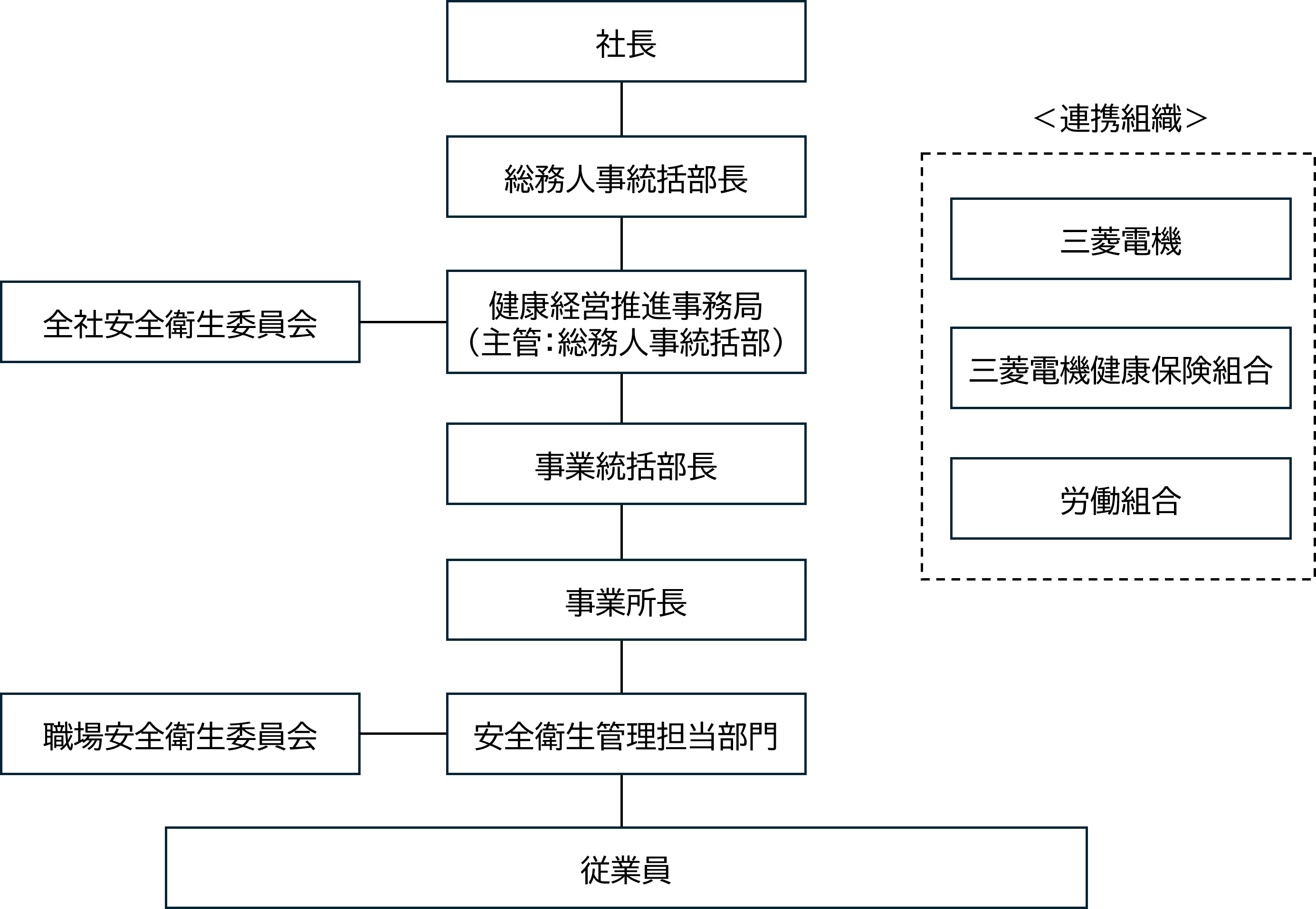 社長をトップとし、安全衛生管理を担当する総務人事統括部を中心に、社内各部門、三菱電機健康保険組合、労働組合等が連携し健康課題に取り組みます。