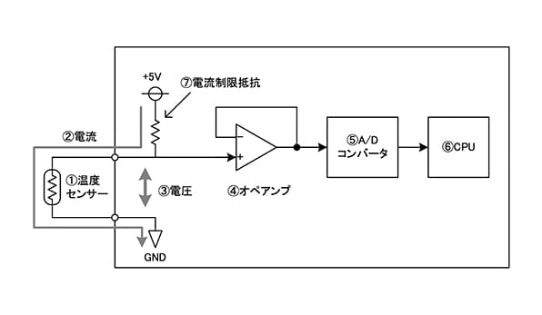 アナログ入力部の回路を図3に示す。温度センサー(図3①)の抵抗値は温度によって一意に定まるため、車冷基板から温度センサーに一定の電流(図3②)を流すことで、温度センサーの抵抗値を電圧(図3③)として検出する。検出した電圧はオペアンプ(図3④)を用いたボルテージフォロワ回路(注2)を介し、A/Dコンバータ(図3⑤)にてデジタル信号に変換後、CPU(図3⑥)に受け渡している。