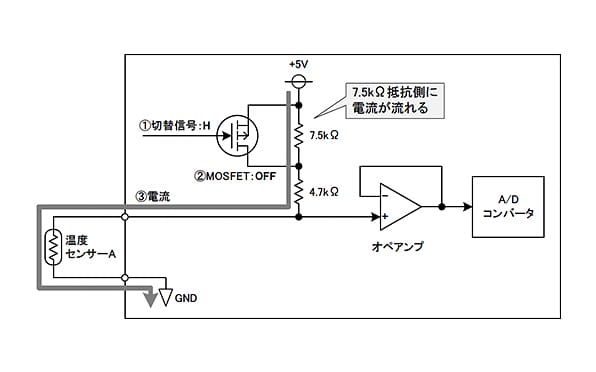 温度センサーAを接続する際は、切替信号の出力を空調制御ソフトウェアでHighレベル(図5①)に設定し、MOSFETをオフ状態(図5②)にする。電流が図5③の経路で流れるため、7.5kオームと4.7kオームの合成抵抗である12.2kオームで電流制限がかかり、温度センサーAの接続に適した回路となる。