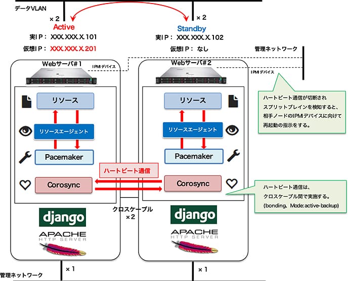 主要サーバはHAクラスタリングを実現するためにPacemaker+Corosyncを用いた。