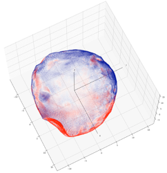 モデル間の相違を見るため、DLR形状モデルの表面上にGAS-DLRの差(半径差)を表示したものを図2に、自転モデルについては同一時刻における極軸方向の角度差及び緯経度ゼロ方向の角度差を図3に示す。なお、図2において赤の部分はGASに比較しDLRの半径が長い箇所を、青の部分はその逆を表している(スケール的に判別できないが線分長が半径差を示している)。