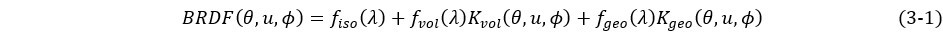 Ross Thickカーネルは、植生などの複雑な地表における体積散乱を表し、Li Sparseカーネルは高さのある樹木等が独立して散乱する状況を表す。