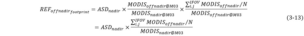 RRVの地表面反射率測定サイトにて「ナディア(直上)方向から測定した“単一地点での地表面反射率”」から“衛星のフットプリントに対応する地表面反射率”を求めるために、フットプリント内に含まれるMODISグリッドを使用し、式(3-13)により算出した。