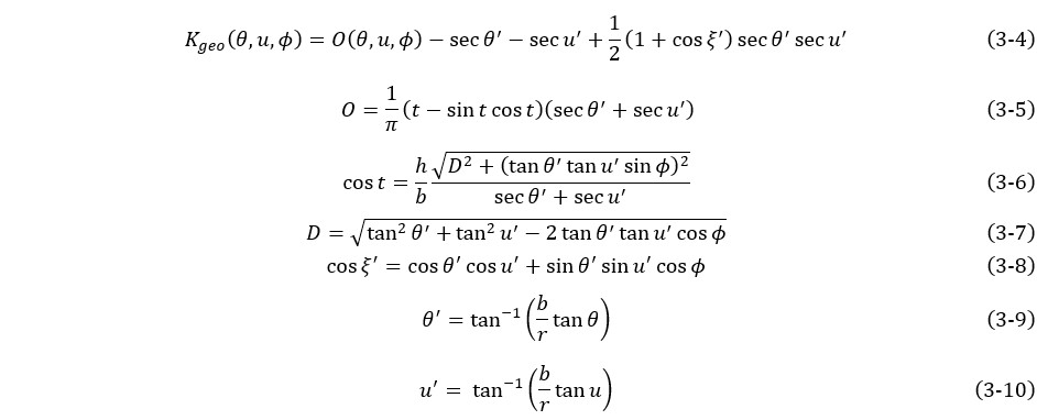 幾何散乱成分のLi Sparseカーネルは、太陽に照射される樹幹による散乱と影とならなかった地表面の散乱の和として、以下のようにあらわされる。