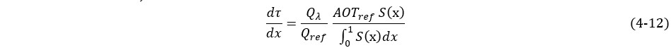 AOTrefはAERONETによる実際の観測値である値であり、解析対象波長ウインドウに最も近い波長のAOTをリファレンスとして使用する。Qλは波長λにおける消散効率である。