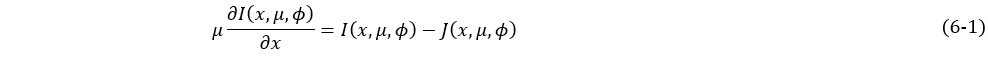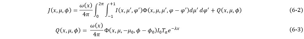 式中のI(x,μ,φ)は、入射した放射輝度が一次散乱や吸収を受けることで生じる減衰①を表す。また、②および③は放射輝度の増加要因であり、放射源関数J(x,μ,φ)と呼ぶ。